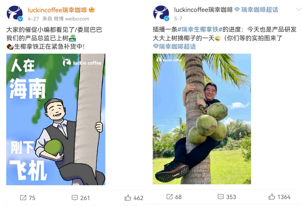 為回應(yīng)顧客的“催貨”,瑞幸微博聯(lián)動曬出產(chǎn)品經(jīng)理上樹的卡通海報(bào)和實(shí)景圖,這波互動成功制造了話題點(diǎn)并收割大波好感。