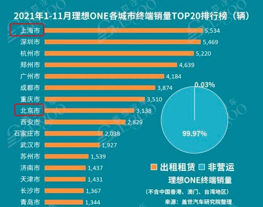 同時,也正是因為這個政策,在北京,理想ONE 的銷售情況并不算好看。以理想ONE 2021年1-11月終端銷量來看,上海位列第一,銷量為5534輛,而北京位列第八,銷量為3138輛,后者僅為前者的56%。