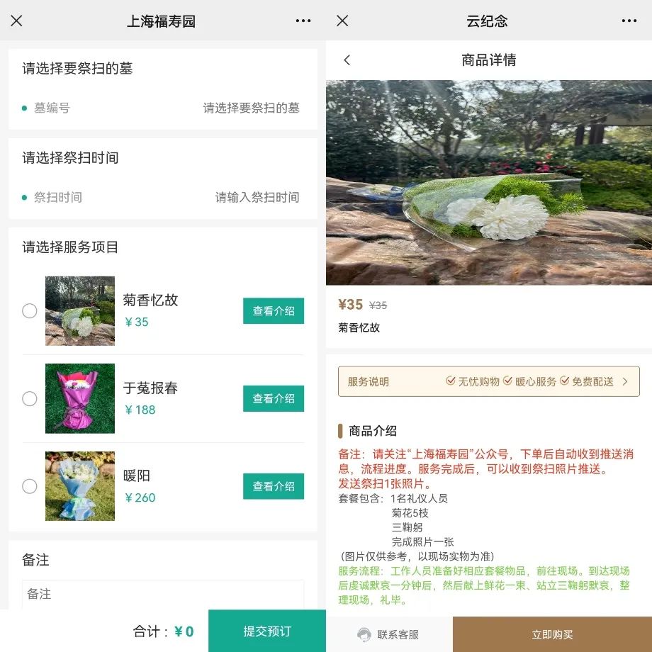 不少城市的公墓和殯葬服務(wù)公司其實(shí)都有類似的服務(wù),比如福壽園就在官網(wǎng)和微信公眾號上設(shè)立了專區(qū),家屬能通過“云紀(jì)念”創(chuàng)建一個虛擬紀(jì)念館,還能在虛擬紀(jì)念館中放上逝者的日常照片、視頻等,記錄逝者的人生故事,祭拜頁面也有不少祭品可供選擇。而“代客祭掃”服務(wù)中,根據(jù)不同的服務(wù)內(nèi)容,價格從35元~260元不等,包括上香,供奉貢品,清理墓碑,代客鞠躬敬禮等。完成服務(wù)后,客服還會給客人發(fā)送相對應(yīng)的視頻和照片,表明服務(wù)完成。