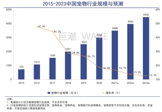 艾瑞咨詢發(fā)布的《2021年中國寵物消費趨勢白皮書》則顯示,2020年我國城鎮(zhèn)寵物市場規(guī)模接近三千億元,2015—2020年6年間復合增速達到32.8%。根據(jù)《白皮書》預測,未來三年我國寵物行業(yè)復合增速在14.2%,到2023年規(guī)模將達到4456億元。