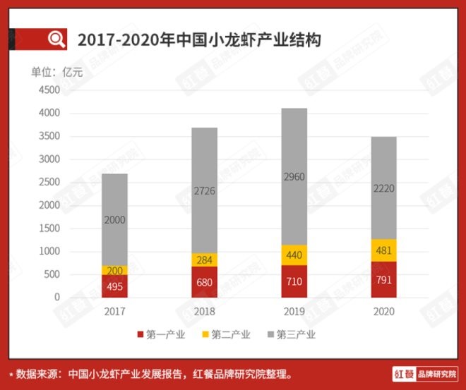 其中,小龍蝦養(yǎng)殖業(yè)產(chǎn)值約為748.38億元,同比增加11.35%;以加工業(yè)為主的第二產(chǎn)業(yè)產(chǎn)值約為480.08億元,同比增長9.11%;受新冠肺炎疫情沖擊,以餐飲為主的第三產(chǎn)業(yè)產(chǎn)值約為2220億元,同比下降25%。