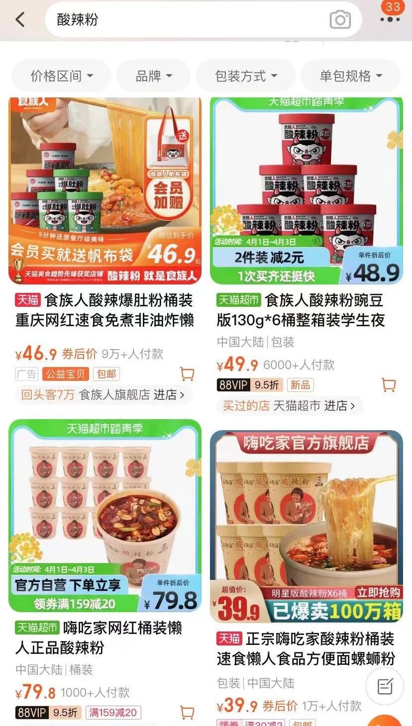 以酸辣粉產(chǎn)品為例,目前網(wǎng)上銷量靠前的是食族人、我的天吶等品牌,月度銷量普遍在5-10萬件左右。