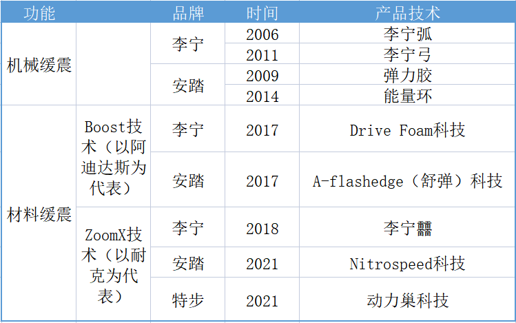 如下圖,以材料緩震功能為例,在市面上主導(dǎo)的兩大類別中,直到2021年特步才推出動力巢的中底技術(shù)。