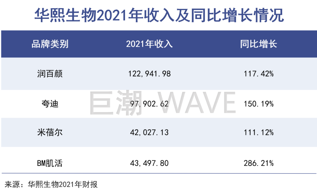 華熙生物董事長趙燕表示:“2021年是華熙生物戰(zhàn)略發(fā)展的關(guān)鍵年”,除了玻尿酸的高增長之外,主要就是四大品牌。其功能性護(hù)膚品收入占總收入近七成,同比增長146.57%,其中潤百顏單品首次實現(xiàn)單品牌年收入過10億元。