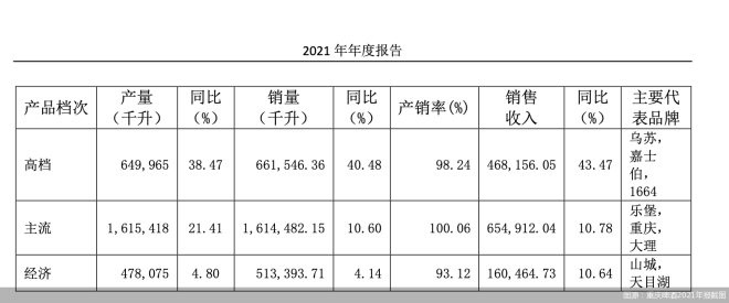數(shù)據(jù)顯示,2021年,重慶啤酒實(shí)現(xiàn)營(yíng)收131.19億元,同比增長(zhǎng)19.9%;實(shí)現(xiàn)歸屬于公司股東的凈利潤(rùn)11.66億元,比上年同期(備考報(bào)表數(shù)據(jù))增長(zhǎng)38.82%,比上年同期(法定披露數(shù)據(jù))增長(zhǎng)8.3%;實(shí)現(xiàn)啤酒銷量為278.94萬(wàn)千升,比上年同期242.36萬(wàn)千升增長(zhǎng)15.1%。此外,按產(chǎn)品檔次劃分,以烏蘇、嘉士伯、1664為主的高檔產(chǎn)品實(shí)現(xiàn)營(yíng)收約46.82億元,在主營(yíng)業(yè)務(wù)收入中占比約36.5%。