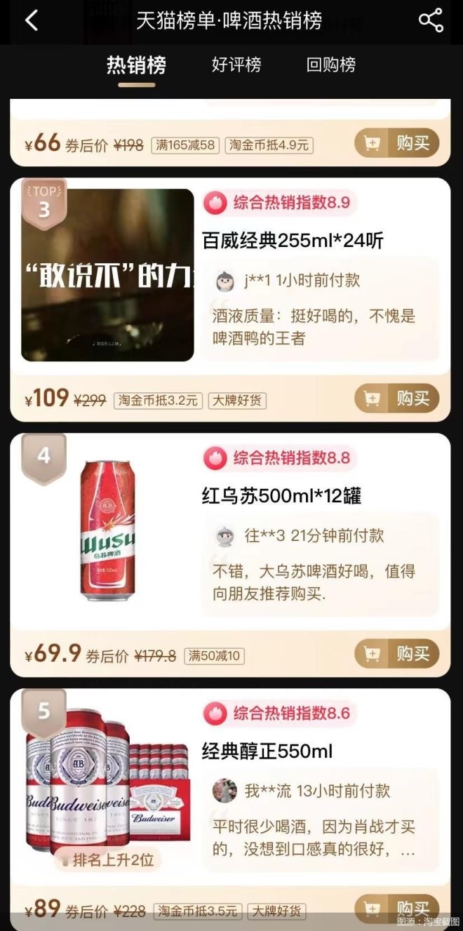 登錄天貓平臺(tái),北京商報(bào)記者注意到,在天貓榜單啤酒熱銷榜、好評(píng)榜與回購(gòu)榜中,紅烏蘇啤酒分別排名第四名、第三名、第六名。此外,該產(chǎn)品月銷量超1萬(wàn)單、產(chǎn)品評(píng)價(jià)超2萬(wàn)條。