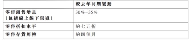 根據(jù)公告,一季度特步主品牌在中國內地的零售銷售同比增長30%-35%,零售折扣水平約七五折,零售存貨周轉約四個月。