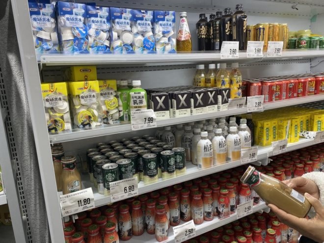 當(dāng)然,從價(jià)格上來看,3.6元相對于線下傳統(tǒng)商超和天貓渠道的5.3元來說的確要便宜不少。值得一提的是,諸如星巴克、元?dú)馍、百事等頭部品牌均擺放在店內(nèi)醒目位置,1元1瓶的依云礦泉水更是直接擺放在內(nèi)店門口旁。而這些品牌的折扣相對于其他不那么知名的二三線產(chǎn)品來說也要低上不少。