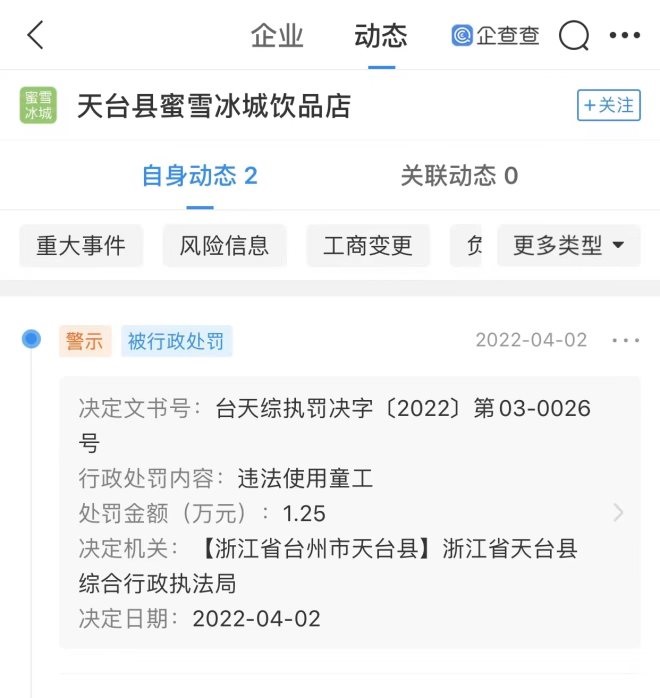 蜜雪冰城一門店因違法使用童工被罰款1.25萬