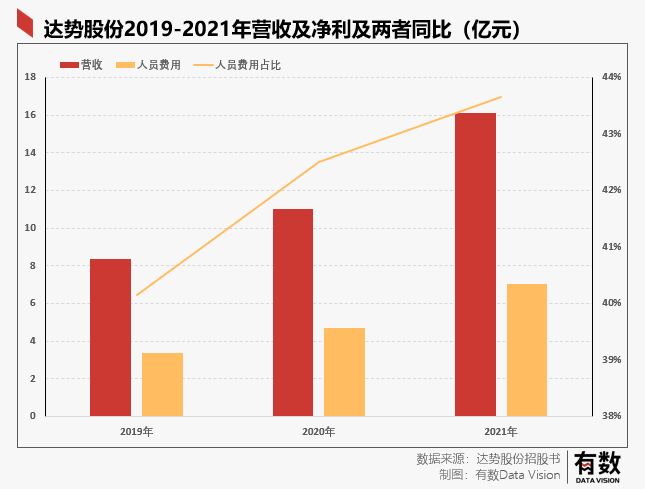 根據(jù)招股書顯示,2019-2021三年,員工薪酬開支是達(dá)勢股份中占比最高的一項(xiàng)成本費(fèi)用,三年分別花了3.4億,4.7億,7億,占總營收的比率分別為40.15%,42.5%,43.66%,占比不斷提高,光員工工資就花出去一半的營收。