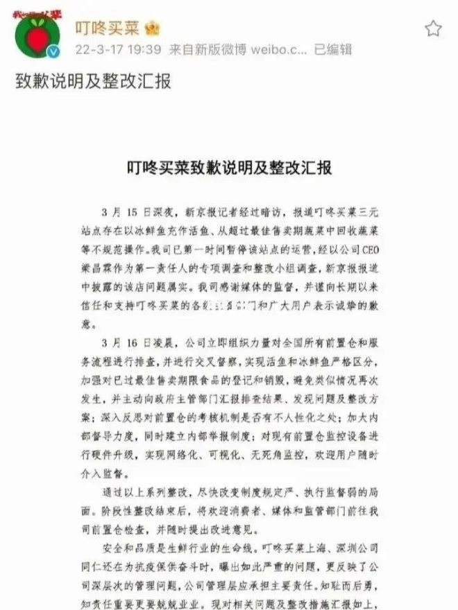 無獨有偶,有媒體報道稱,叮咚買菜因前置倉存在用死魚冒充活魚等問題,于3月16日被海淀區(qū)市場監(jiān)督局約談并啟動立案調(diào)查。受該消息影響,17日晚間叮咚買菜美股盤前一度跌幅超過20%。