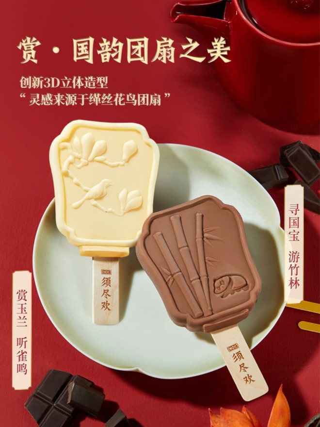升級(jí)后的須盡歡冰淇淋,以古人納涼解暑用的“團(tuán)扇”為靈感,采用“3D成型技術(shù)”形成熊貓和鳥(niǎo)雀的立體雕花。棒簽做成詞牌形狀,刻上了經(jīng)典詩(shī)詞句,外袋采用米色和紅棕色的古典色,精致程度可見(jiàn)一斑。