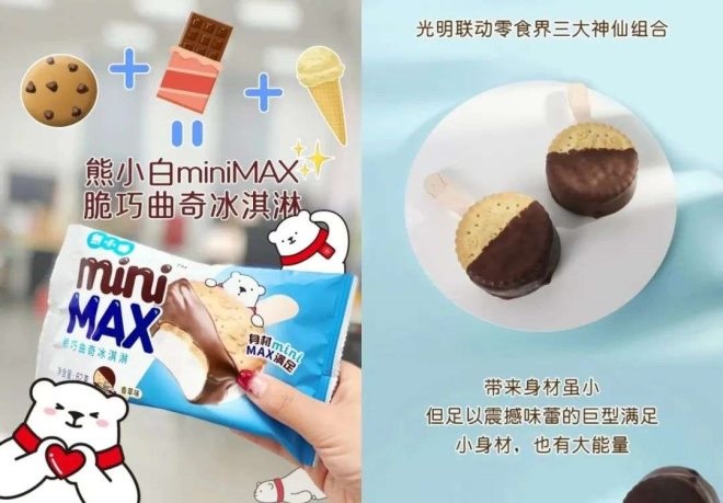 光明旗下熊小白就推出一款「miniMAX脆巧曲奇冰淇淋」,組合起“零食屆三大巨頭”,餅干、巧克力、冰淇淋。冰淇淋做成了夾心餅干的樣式,巧克力則作為最外層的脆皮。品牌稱,這款冰淇淋個(gè)頭雖mini,但帶來(lái)“足以震撼味蕾的巨型滿足”。