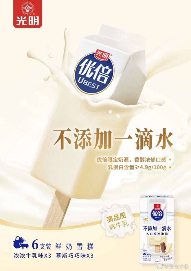 光明則用旗下優(yōu)倍鮮奶的口碑背書(shū),推出「優(yōu)倍鮮奶冰淇淋」,配料表首位“鮮牛乳≥60%”。