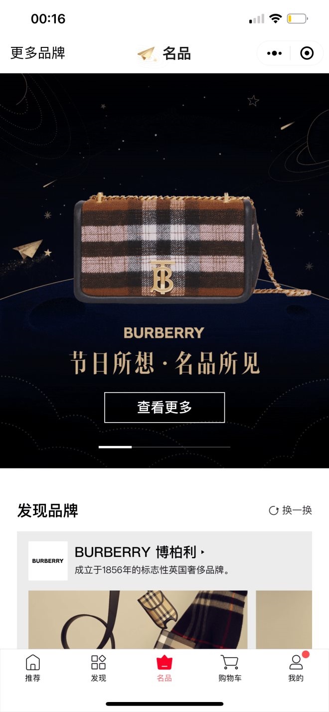 基于微信小程序的持續(xù)深耕,Burberry跟微信生態(tài)的綁定愈發(fā)緊密。去年8月,騰訊旗下購物入口小程序騰訊惠聚正式上線“名品”欄目,而Burberry則是首批與騰訊惠聚名品合作的眾多奢侈品牌之一。通過“名品”欄目,用戶可即時獲取品牌最新的精品內(nèi)容和品牌理念,并一鍵直達(dá)Burberry官方小程序,進(jìn)一步增強(qiáng)了品牌和用戶的情感連接。
