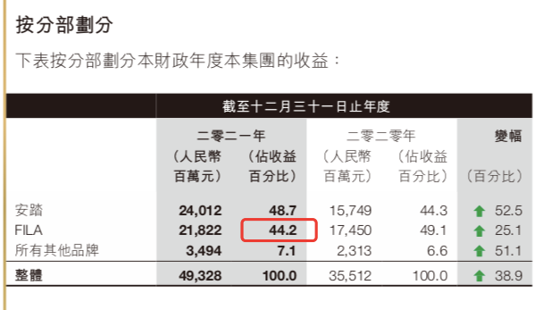 FILA自歸于安踏之后,為安踏實(shí)現(xiàn)了“再造一個(gè)安踏”的夢想。據(jù)安踏最新財(cái)報(bào),F(xiàn)ILA收入占比達(dá)44.2%,儼然已經(jīng)成為了安踏的半壁江山。