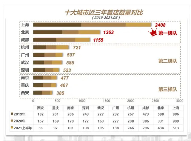 據(jù)中商數(shù)據(jù)發(fā)布的《2021年中國首店經(jīng)濟發(fā)展報告》顯示,上海、北京、成都位居國內(nèi)首店經(jīng)濟“第一梯隊”;杭州、廣州、武漢、深圳位居首店經(jīng)濟“第二梯隊”;南京、重慶、西安位居“第三梯隊”。