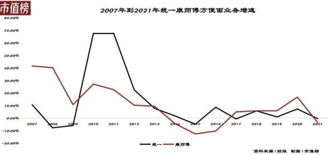 在這之前,康師傅方便面業(yè)務(wù)增速高達(dá)20%、統(tǒng)一甚至能夠達(dá)到67%的增速,但2013年后,他們的方便面業(yè)務(wù)增速回落到個位數(shù),甚至出現(xiàn)負(fù)增長。