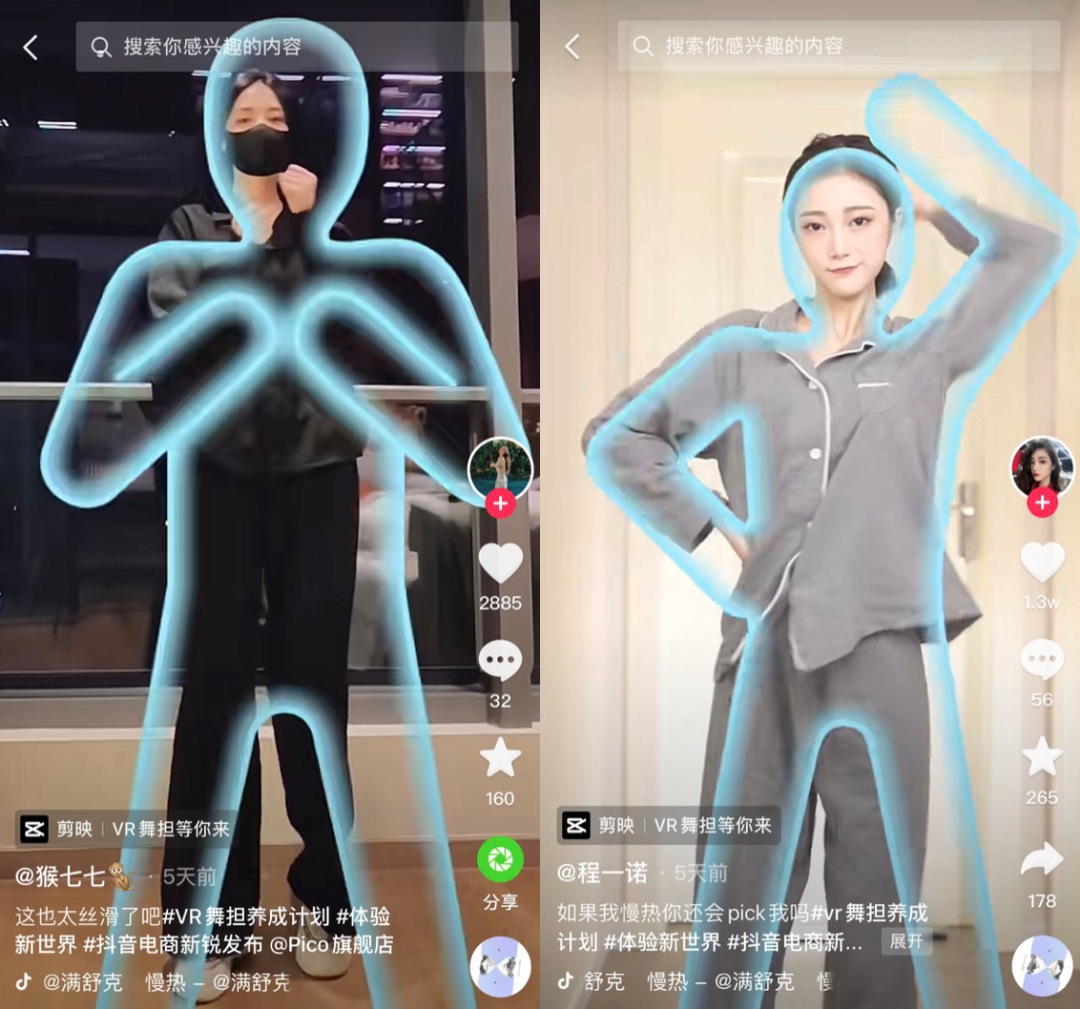 在挑戰(zhàn)賽中,抖音電商新銳發(fā)布聯(lián)合Pico結(jié)合產(chǎn)品特性定制了互動(dòng)剪映道具,讓用戶可以直接體驗(yàn)VR應(yīng)用《Oh Shape》中用舞蹈動(dòng)作穿越光墻的趣味玩法。這一特效道具降低了用戶參與挑戰(zhàn)的門檻,同時(shí)提升了互動(dòng)性和愉悅感。用戶只需玩在其中,品牌就能夠獲得“自來水”傳播。