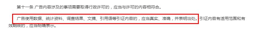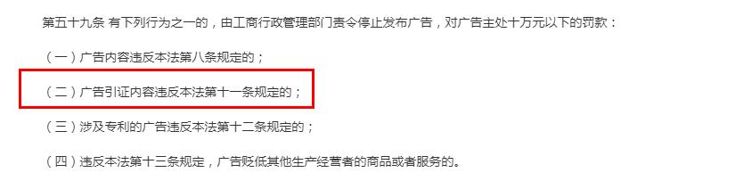 而《廣告法》第十一條則明確指出,“廣告使用數(shù)據(jù)、統(tǒng)計(jì)資料、調(diào)查結(jié)果、文摘、引用語(yǔ)等引證內(nèi)容的,應(yīng)當(dāng)真實(shí)、準(zhǔn)確,并表明出處”,違反本規(guī)定,可根據(jù)《廣告法》第五十九條,對(duì)廣告主處十萬(wàn)元以下的罰款。