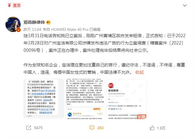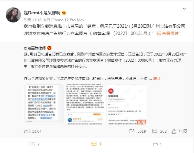 在那之后,4月7日,該律師再次發(fā)微博稱(chēng),“繼3月31日電話(huà)告知我已立案后,剛剛廣州黃埔區(qū)政府發(fā)來(lái)短信,正式告知:已于2022年3月28日對(duì)廣州寶潔有限公司涉嫌發(fā)布違法廣告的行為立案調(diào)查(穗黃案件〔2022〕00096號(hào)),案件正在辦理中,案件處理完畢后結(jié)果將向社會(huì)公示”。