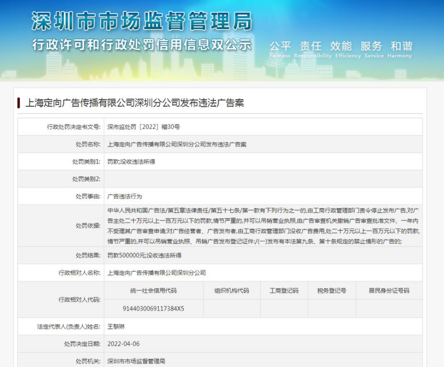 無(wú)獨(dú)有偶,4月6日,深圳市市場(chǎng)監(jiān)督管理局發(fā)布信息稱(chēng),上海定向廣告?zhèn)鞑ビ邢薰旧钲诜止疽蜻`法了《廣告法》第九條、第十條規(guī)定的禁止情形廣告行為,被罰款50萬(wàn)元并沒(méi)收違法所得。值得一提的是,據(jù)此前媒體報(bào)道,該廣告公司為Ulike脫毛儀“沒(méi)有藍(lán)寶石,我不脫”廣告的發(fā)布商。