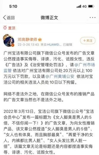譬如,3月24日,法制日?qǐng)?bào)官方微博就引用了北京市東元律師事務(wù)所律師孔磊的觀點(diǎn):“商業(yè)營(yíng)銷(xiāo)應(yīng)堅(jiān)守法律和道德底線,切實(shí)履行保護(hù)消費(fèi)者權(quán)益的義務(wù)。我國(guó)廣告法明確規(guī)定,廣告不得妨礙社會(huì)公共秩序或者違背社會(huì)良好風(fēng)尚。這些不當(dāng)內(nèi)容涉嫌違背社會(huì)良好風(fēng)尚,屬于廣告法禁止的情形。另外,商家可以推銷(xiāo)自家產(chǎn)品,但不能無(wú)視女性消費(fèi)者所享有的消費(fèi)者權(quán)益保護(hù)法規(guī)定的受尊重權(quán)”。