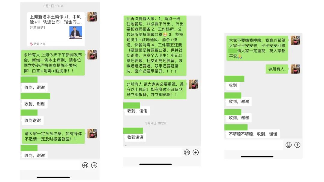 3月1日,上海通報有第一例陽性確診,柏青下午就在實習(xí)生群里@所有人,“請各位同學(xué)口罩+消毒+勤洗手!!”3月10日,實習(xí)生全部完成了疫苗加強針接種。3月16日,又是實習(xí)生全員核酸檢測,一切正常。柏青在群里提示大家注意防護,也從兩個感嘆號,變成三個感嘆號。他說“你們不要嫌我啰嗦,我真心希望大家平平安安來,平平安安回(學(xué)校)”。
