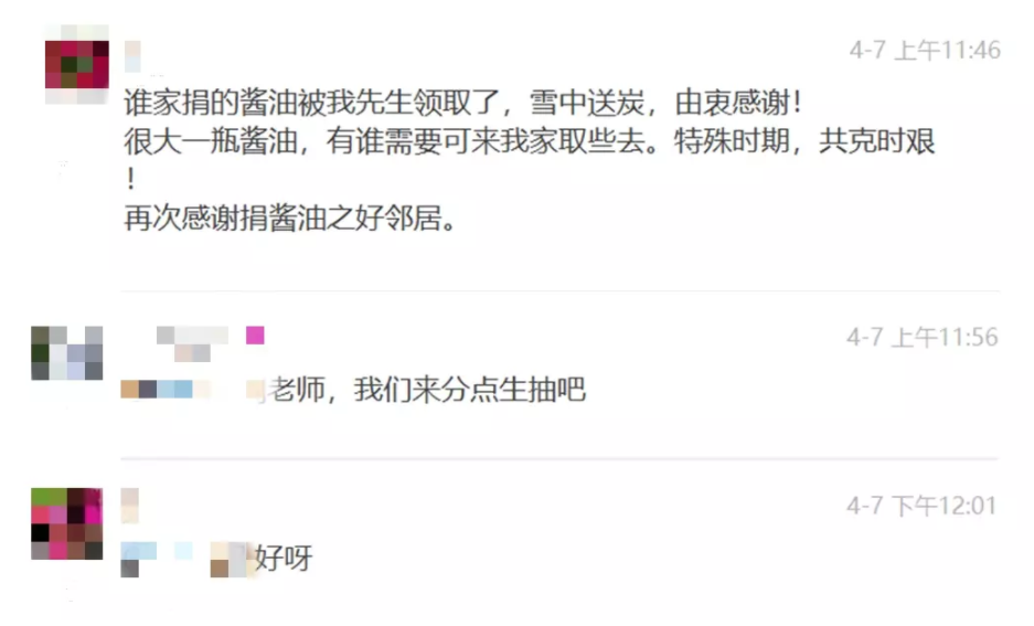 原本以為這事就告一段落了,沒想到的是,我家換出的醬油竟成了歡迎物資,領(lǐng)了醬油的鄰居還特意在樓群里發(fā)來了感謝,再后來還有業(yè)主拿著空瓶去分醬油。