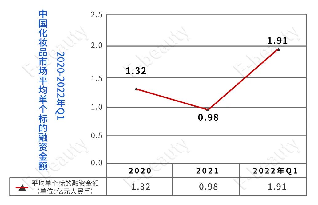 同時,單個標(biāo)的平均融資金額也在提高。2022年一季度單個化妝品項(xiàng)目的平均融資金額高達(dá)1.91億元,比2021年的0.98億元翻了幾乎一倍,超過2020年的1.32億元。