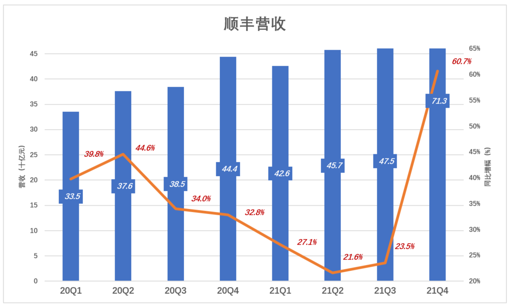 2021年Q4,業(yè)務(wù)量同比增長(zhǎng)20.4%,營(yíng)收增速突破60%(注:2021年9月28日,完成對(duì)嘉里物流51.5%股權(quán)的收購(gòu),10月開始并表)。