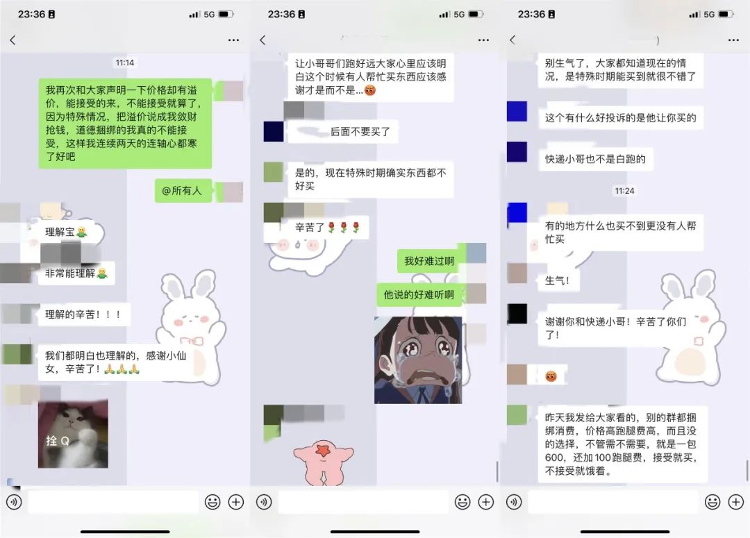 “我在群里和大家三令五申就是不要挑貨。特殊時期,外賣小哥不僅少,而且他還需要跑很多地方才能夠找到開門的商店。所以,跑腿費肯定要比平時高。我是把跑腿費均攤到物品費用里面的?伤I東西多還不接受人家高額跑腿費,解釋無果。”陳嫻被一大早的客訴搞得很無奈。
