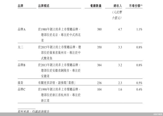 另外,據(jù)綠茶集團(tuán)最新披露材料與灼識咨詢報告,綠茶餐廳在2021年五大休閑中式餐廳品牌排名第四,市場份額為0.5%,2021年總收入23億元。而排在其前位的三個品牌雖未全部實(shí)名,但根據(jù)北京商報記者從其披露的資料來看,上述三個品牌分別為西貝、太二以及小菜園,其市場占有率分別為1.1%、0.8%、0.8%。三個品牌2021年總收入分別為47億元、33億元以及32億元。由此可見,即便綠茶餐廳作為休閑中式餐廳運(yùn)營商較大參與者,但從整體數(shù)據(jù)來看,仍與前者們存在一定差距。