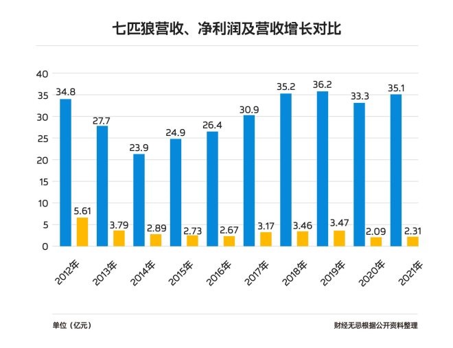 顯然,這一小步并不足以讓七匹狼重新像昔日一樣在廣闊的大地上奔跑——在過(guò)去的十年里,七匹狼是中國(guó)男裝品牌中一個(gè)很有意思的存在,在2012年達(dá)到34.77億元的營(yíng)收峰值后,七匹狼的營(yíng)收水平就像上證指數(shù)怎么都繞不開(kāi)“3000點(diǎn)”一樣,一直在原地踏步。