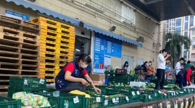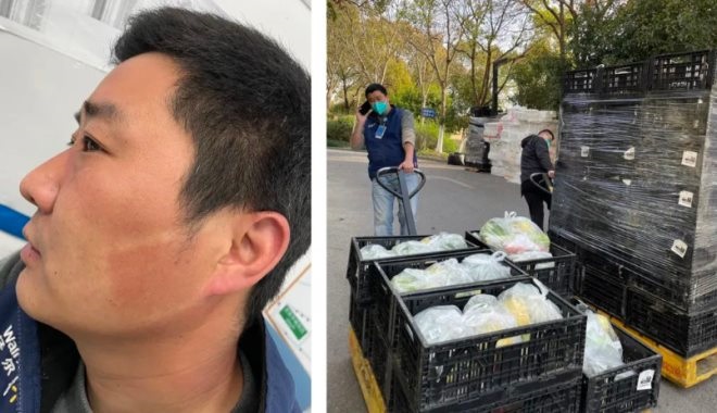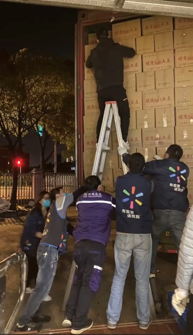 三月底,沃爾瑪?shù)?0萬份食品包和3.5萬蔬菜包物資開始分批、陸續(xù)抵送上海。到了卸貨的環(huán)節(jié)也需要人,門店的四位員工,有一天鉆進(jìn)十幾米長的貨柜,一箱箱的把當(dāng)天到貨的物資搬出來,凌晨2點07分,他們在微信里回復(fù)三個字:搞完了。