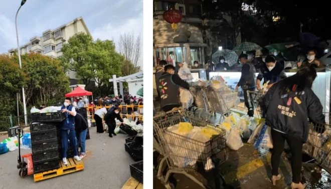 ▲這是施灣店的同事在往社區(qū)運輸物資。日曬已經(jīng)在他的臉上留下痕跡。上面的視頻,是居民在家里拍到的畫面。畫外音是,“物資要來了物資要來了,這是到我們小區(qū)的嗎?”