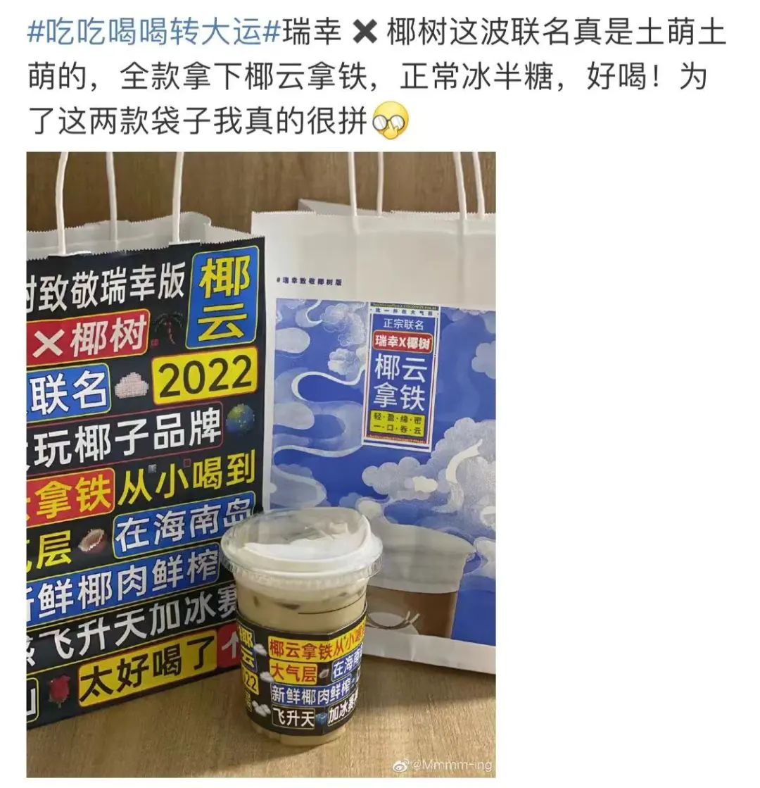 4月11日,瑞幸與椰樹(shù)聯(lián)名的“椰云拿鐵”正式上市。這款新品采用瑞幸的“椰云工藝”,用椰漿代替常規(guī)奶蓋,號(hào)稱(chēng)“輕盈綿密”和“一口吞云”。瑞幸還沿襲椰樹(shù)椰汁的包裝風(fēng)格,為這款新品設(shè)計(jì)了定制杯套和袋子。