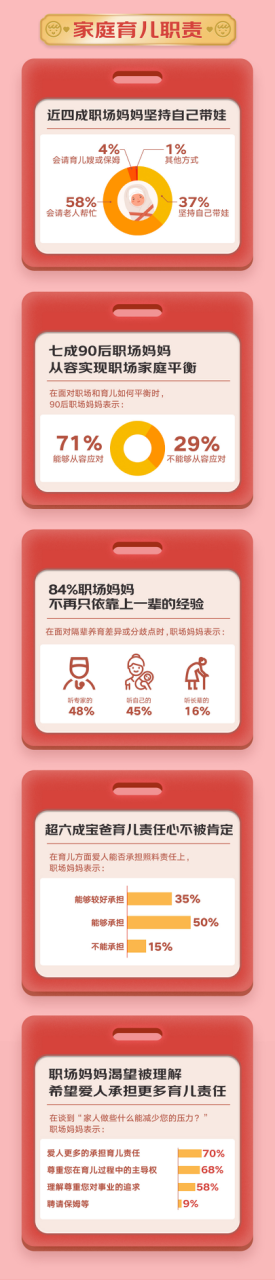 一邊是工作,一邊是家庭,育兒分工成了職場媽媽們面臨的首要問題。為了給孩子更好的陪伴,37%的職場媽媽堅持自己帶娃。同時,請老人幫忙分擔(dān)帶娃壓力仍是主流選擇,數(shù)據(jù)顯示58%的職場媽媽選擇請老人幫忙。
