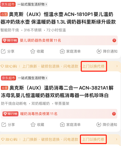 喂養(yǎng)類電器產(chǎn)品讓育兒過程更輕松、方便,售后服務(wù)差則為職場媽媽們的使用造成了阻礙。為此,京東超市打造“上門以換代修”獨家服務(wù),對在保修期內(nèi)的吸奶器、輔食料理機(jī)、暖奶消毒器,采取上門取件時直接更換商品做法,解決急用難題。