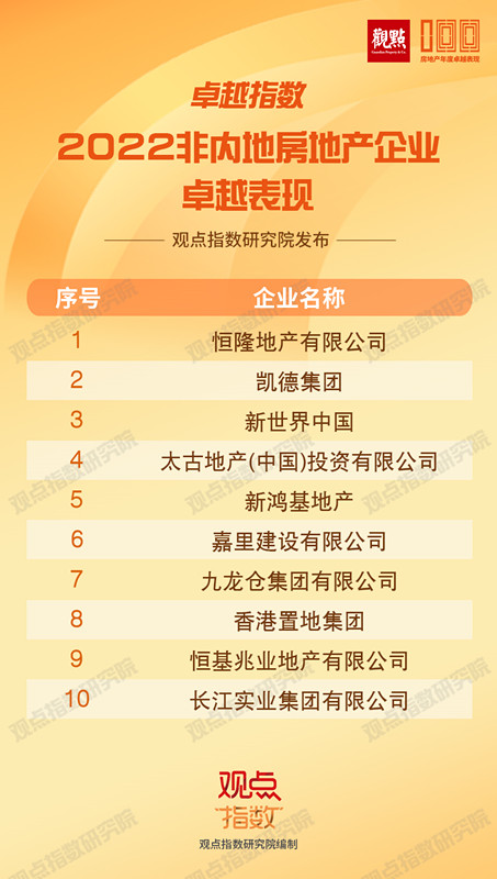 2022非內(nèi)地房地產(chǎn)企業(yè)卓越表現(xiàn),研究對象為所有在中國內(nèi)地開發(fā)、投資及運營項目的非內(nèi)地房地產(chǎn)企業(yè),主要從營運、管理、商業(yè)模式、品牌等方面進行綜合研究。