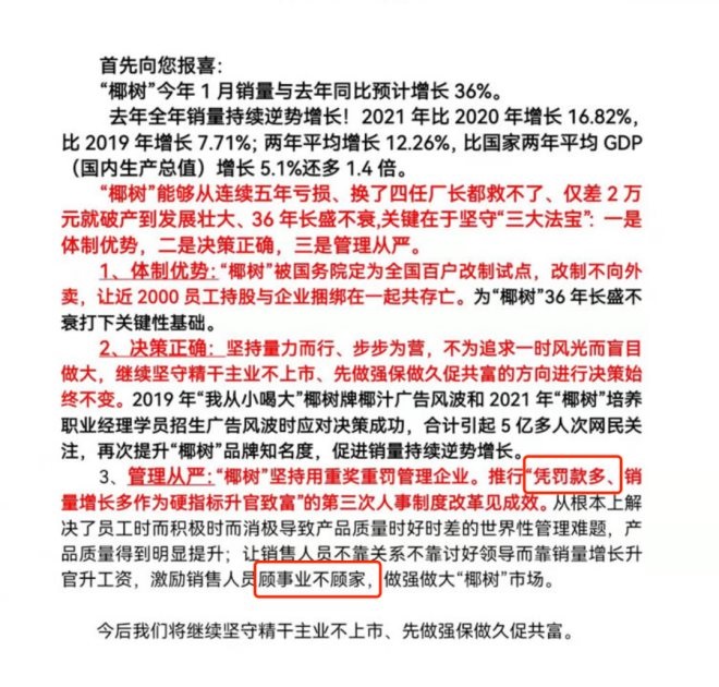 在《開(kāi)門紅報(bào)喜》一文中,椰樹(shù)集團(tuán)明確提出,集團(tuán)堅(jiān)持用重獎(jiǎng)重罰管理企業(yè),推行“憑罰款多、銷量增長(zhǎng)多作為硬指標(biāo)升官致富”的第三次人事制度改革,由此從根本上解決了“員工時(shí)而積極時(shí)而消極導(dǎo)致產(chǎn)品質(zhì)量時(shí)好時(shí)差”的世界性管理難題,并激勵(lì)銷售人員“顧事業(yè)不顧家”。
