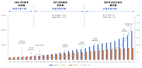 公司作為會(huì)員制倉(cāng)儲(chǔ)連鎖超市的開(kāi)創(chuàng)者,1992 -2021 財(cái)年期間,公司總營(yíng)收從141億美元增長(zhǎng)到1959億美元,復(fù)合增長(zhǎng)約9.5%。會(huì)員費(fèi)收入從 2.8 億美元增長(zhǎng)至 38.8 億美元,增長(zhǎng)14倍,復(fù)合增長(zhǎng)率約 9.5%。公司凈利潤(rùn)也從 2.42 億美元增長(zhǎng)至 50 億美元,增長(zhǎng)近21倍,復(fù)合增長(zhǎng)率約 11%。