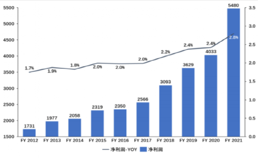 30年來(lái),營(yíng)收的增長(zhǎng)幾乎是從未停止過(guò)。同時(shí),近10年來(lái),利潤(rùn)也實(shí)現(xiàn)了跨越式增長(zhǎng)。從增長(zhǎng)的情況來(lái)看,它具備所有穿越牛熊企業(yè)的特征:穩(wěn)健增長(zhǎng),沒(méi)有大起大落。