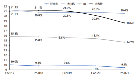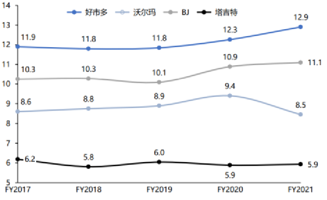 多年來(lái),Costco的費(fèi)用率基本在10%左右浮動(dòng),而對(duì)比同行,沃爾瑪20.7%,BJ批發(fā)俱樂(lè)部15%,塔吉特19.8%。