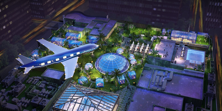 戶外屋頂部分有兩處大型主題「定制」——以「星空之光」為主題的開放式花園坐落于A棟屋頂,包括主題酒吧、外擺休閑餐吧等業(yè)態(tài),和一個(gè)近5000㎡的超大文化娛樂場(chǎng)所,滿足了年輕客群的主流休閑娛樂需求。