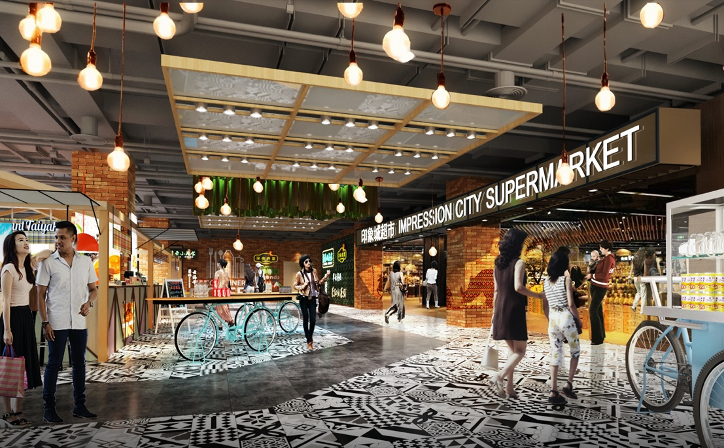 室內(nèi)部分也有兩處主題鮮明的空間:一個(gè)是貫穿于A棟、C棟部分區(qū)域及B棟負(fù)一層,整合集市、美食、零售等特色門店形成復(fù)合型業(yè)態(tài)的「印象集市」;另一個(gè)是融合主題餐飲、演藝劇場(chǎng)、特色體驗(yàn)等功能,具備文旅色彩的街區(qū)「ICON天津」。