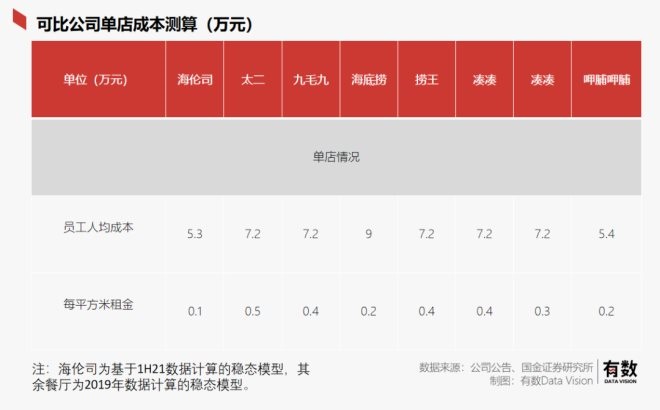 先說員工成本,根據(jù)國(guó)金證券的測(cè)算,海倫司的員工平均成本僅為5.3萬元,遠(yuǎn)低于各大連鎖餐飲,如太二、撈王、湊湊人均成本在7.2萬元附近,海底撈更是高達(dá)9萬元。