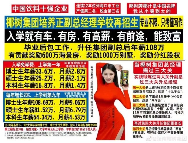 2021年3月25日,椰樹集團(tuán)在其官方微博發(fā)布一則“椰樹集團(tuán)培養(yǎng)正副總經(jīng)理學(xué)校再招生”的廣告,文案稱“入學(xué)就有車、有房、有高薪,肯定有美女帥哥追”,引發(fā)爭議。
