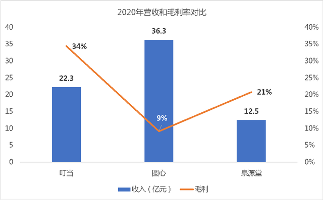 泉源堂定位全渠道藥房,主要有三個(gè)零售渠道:天貓京東等B2C電商平臺(tái)、美團(tuán)餓了么O2O平臺(tái)、線下門店(含DTP),總計(jì)毛利率僅20.8%,低于行業(yè)領(lǐng)頭羊。