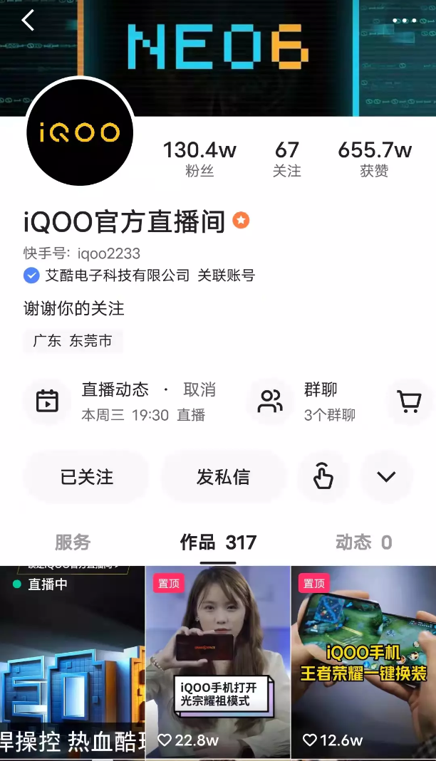 而在4月17日20:00~24:00,擁有2億粉絲的快手小店,還將轉(zhuǎn)播iQOO官方直播間帶貨直播,在4月18日,更是邀請到了王者 KOL 呆阿拿做客iQOO官方直播間,現(xiàn)場更有0元抽iQOO Neo6新品手機的活動。